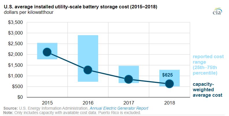 These systems storage electricity produced by generators or pulled directly from the grid; later, they redistribute the energy to where is needed. As the EIA informs, the devices have lowered their cost from $2,152 kilowatt per hour in 2015 to $625 KW per hour in 2018.