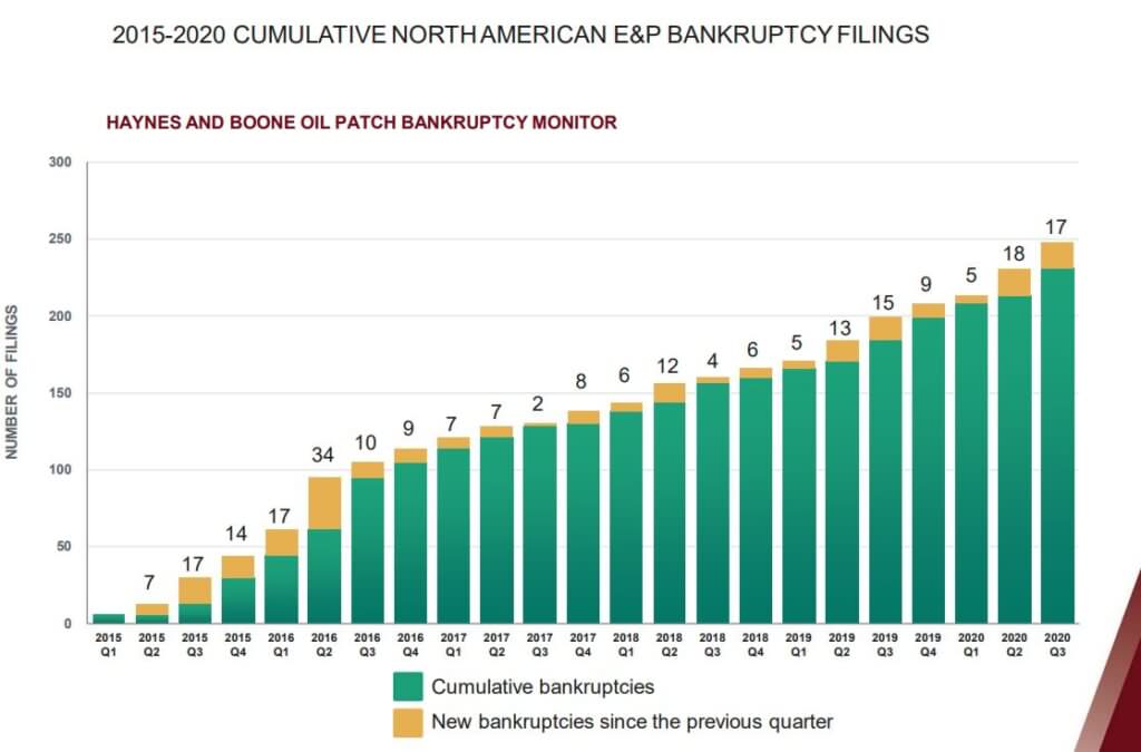 Since Hayes and Boone have kept a record and reported these issues in the industry, over 248 producers have filed for protection. Also, there are over $175 billion, with $50 billion so far in 2020, of aggregate debt.